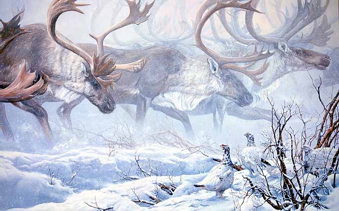 JSL – 1Wildlife – Arctic Procession – Willow Ptarmigans with Caribu © John Seerey-Lester