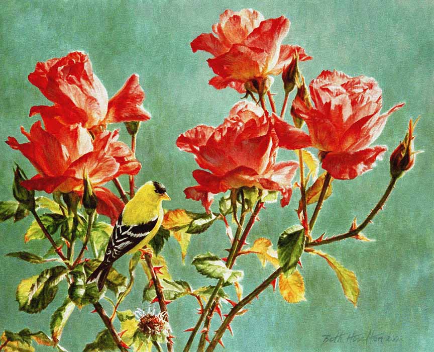 BH2 – Floral – Sunday Afternoon – American Goldfinch and Roses © Beth Hoselton
