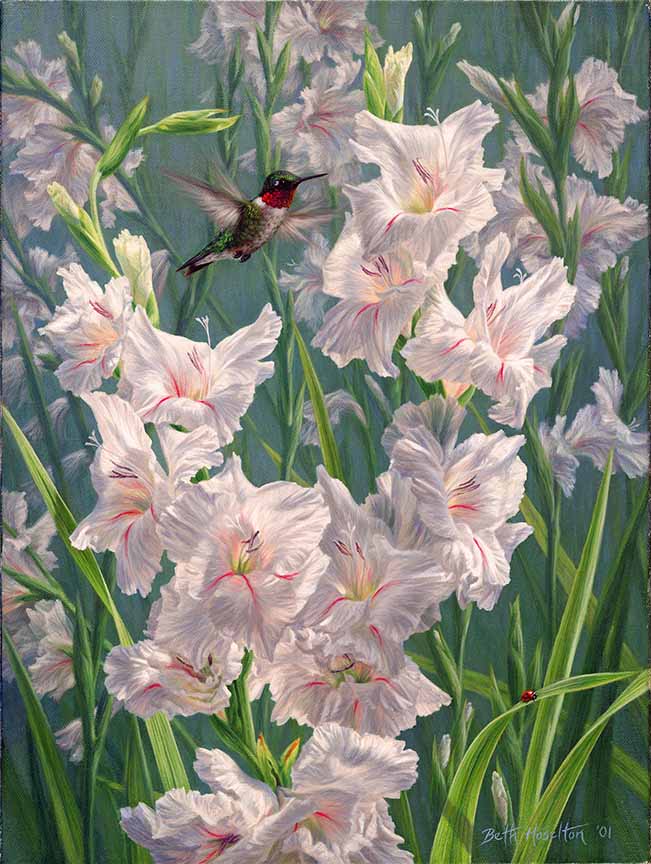 BH2 – Songbirds – Garden Dance – Ruby-Throated Hummingbird and Gladiola © Beth Hoselton