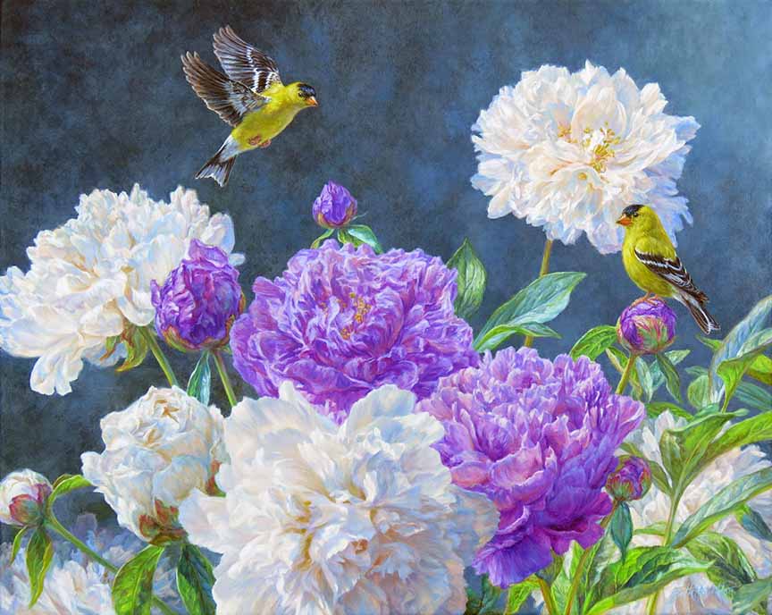 BH2 – Songbirds – Garden Glory – American Goldfinches and Peonies © Beth Hoselton