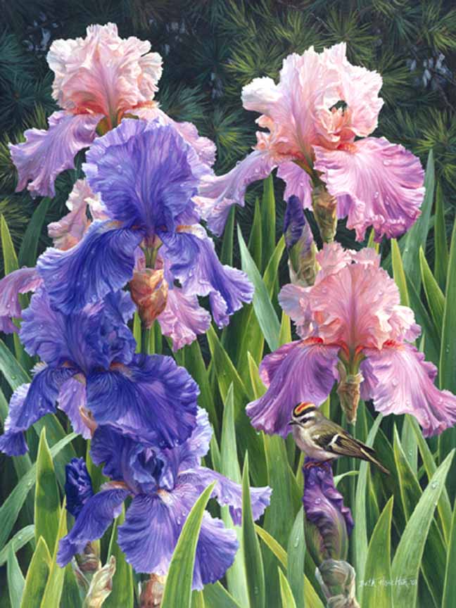BH2 – Songbirds – Garden Light – Golden-Crowned Kinglet and Iris © Beth Hoselton
