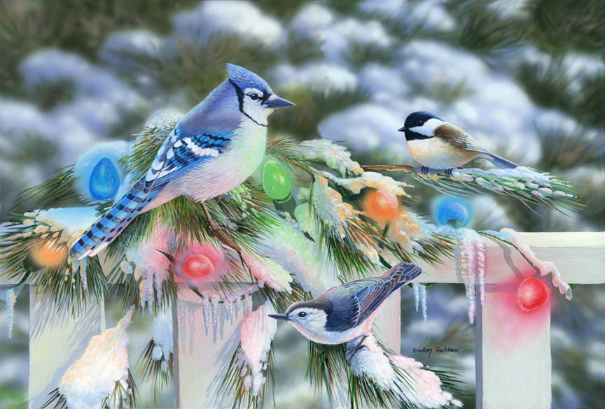 BJ – Christmas Lights – Blue Jays and Chickadee © Bradley Jackson