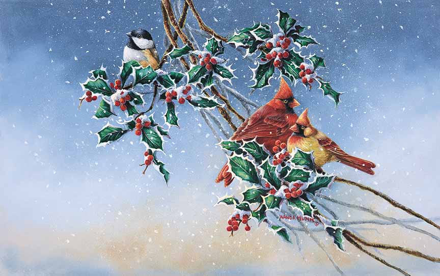 WM – 1Songbird – Chickadee and Cardinals in Holly © Wanda Mumm